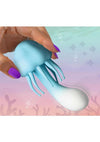 Each motor offers 10 vibration functions — 3 speeds and 7 patterns — run independently. The insertable wand is 3.3" at 1.2" widest diameter. The Aqua Shimmer colorway is a baby blue that fades to white, a strong visual match for the bioluminescent jellyfish character. IPX7 waterproof. USB rechargeable.