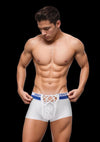 The Sporty Lace-Up Trunk from Envy Menswear is a perfect blend of comfort and style. Crafted from a premium mix of cotton, polyester, and spandex, this trunk offers a soft, breathable, and flexible fit. The crisp white color is accented with a striking blue stripe detail for a modern touch. The waistband features a bold blue Envy logo, ensuring a branded, sophisticated look. The unique lace-up front adds an adjustable, athletic-inspired element, allowing you to customize the fit. Elevate your essentials with Envy's signature style and enjoy unmatched comfort all day long.